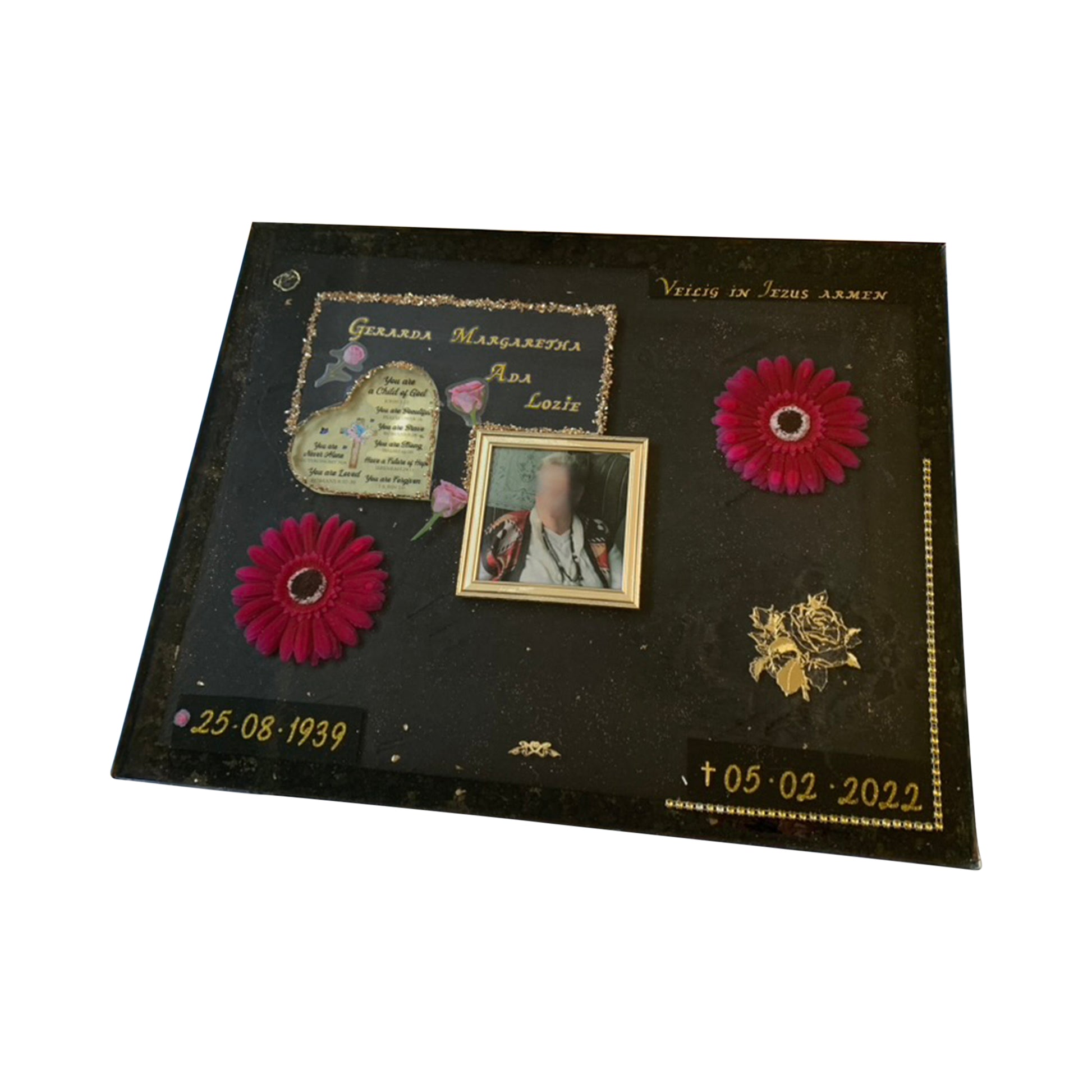 De grafsteen wordt gemaakt door giethars met daarin een foto en de gewenste belettering. Ook is het mogelijk om gewenste elementen en symbolen erin te verwerken.