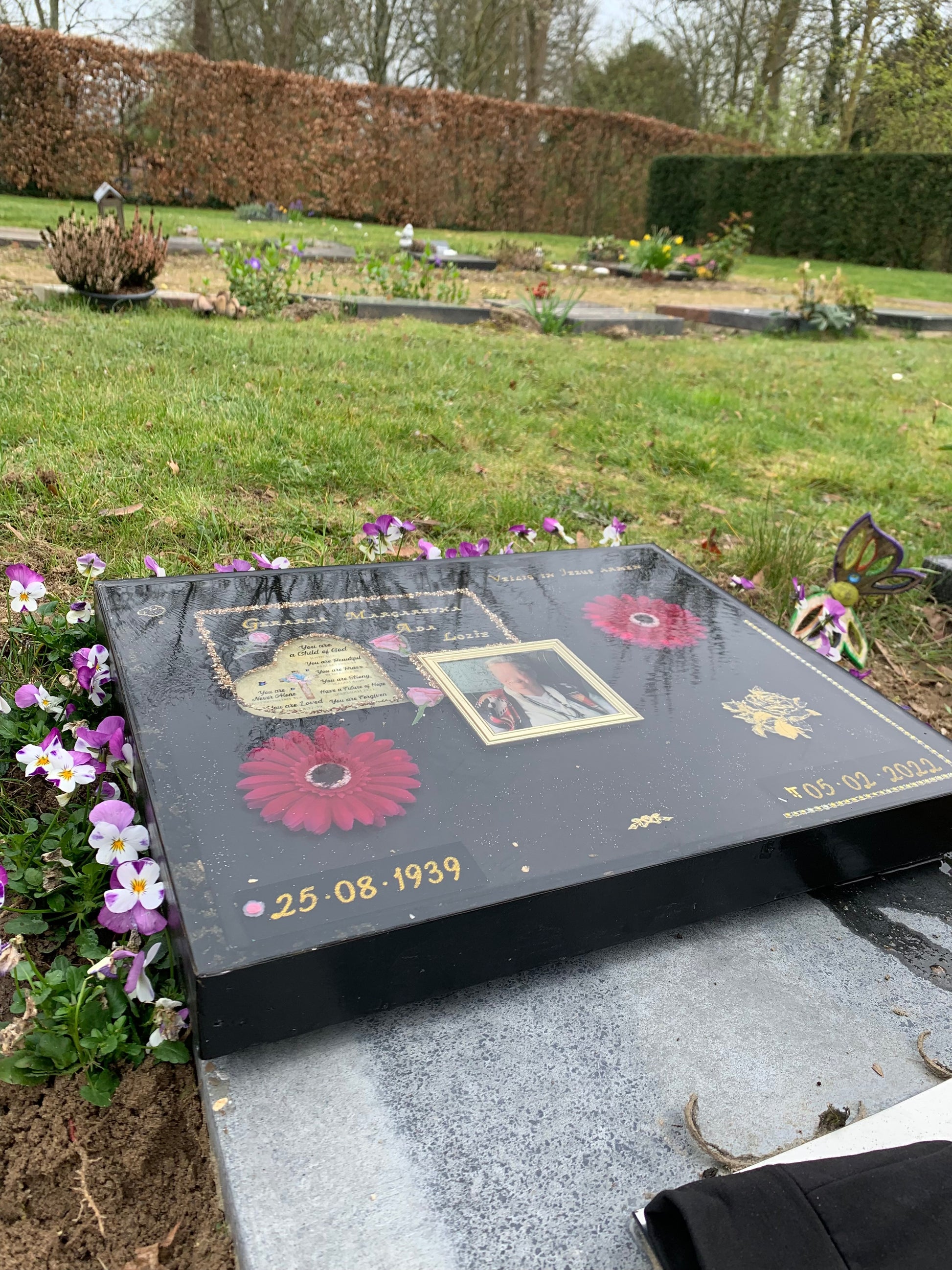 Door de hars geeft het de grafsteen strakke lijnen, dat steeds een bijzondere kijkhoek geeft.